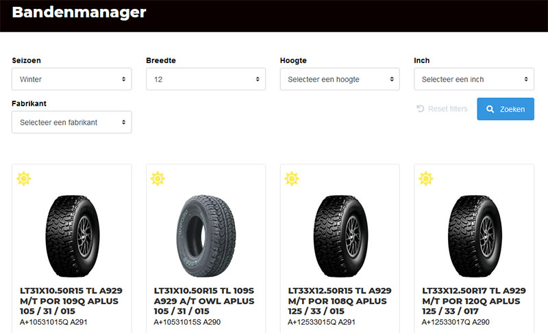 Hieronder ziet u een voorbeeld op de website van Waldo Tyres op hun website https://waldo-tyres.com, welke is ontworpen en gebouwd door Avant Webdiensten. Er is zowel een bandenmanager als een velgenmanager. Via een aantal filters kan er gericht een aantal geschikte banden en velgen worden gevonden.